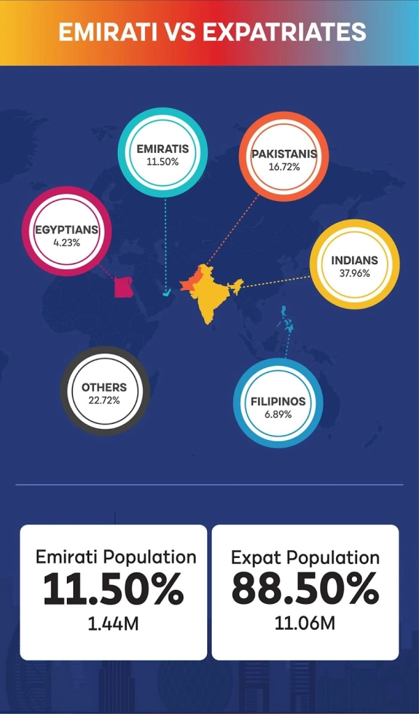 Expatriates account for 88.5% of UAE population (~10 million out of 11.35 million)